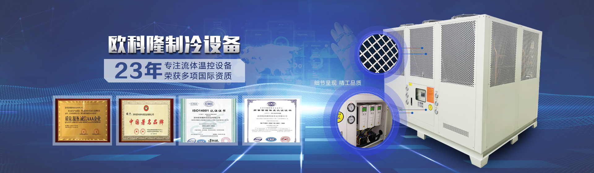 深圳歐科隆科技實業有限公司源自歐洲先進制冷技術和科學管理模式,承襲歐洲人嚴謹務實、精益求精的工作作風。1963年在洛杉磯成立,1999年在香港設立分部正式進軍亞洲市場,后經改革開放招商引資以及日益發(fā)展需求于2006年在深圳成立:深圳歐科隆科技實業有限公司。半個多世紀以來歷經風雨不忘初心、百舸爭流為夢前行一直專注于:工業制冷設備的研發(fā)、生產制造銷售、服務。經營范圍包括:冷水機、螺桿式冷水機組、工業冷水機、水冷式冷水機、風冷式冷水機組、冷凍機、注塑專用冷水機、電鍍冷水機、混泥土專用冷水機箱式冷水機、低溫型冷水機、耐酸堿冷水機、激光冷水機、中央空調柜機、電鍍冷水機、化工冷水機、混凝土冷水機、工業冷凍機、冰水機、非標冷水機、冷卻水塔、模溫機、粉碎機、拌料機等設備及輔助設備。...更多詳情